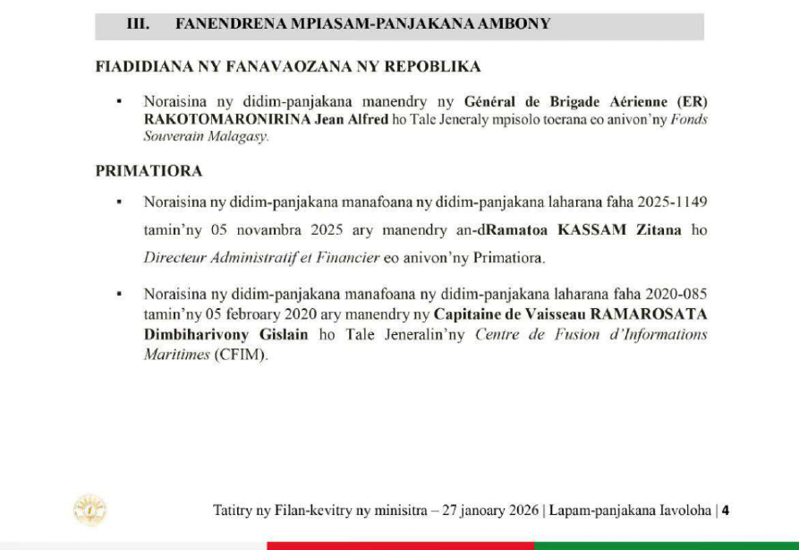 Lors du Conseil des ministres tenu le 27 janvier 2026, le Gouvernement a adopté une décision portant abrogation du décret n° 2020-085 du 05 février 2020. Dans ce cadre, le Capitaine de Vaisseau RAMORASATA Dimbiharivony Gislain a été officiellement nommé Directeur Général du Centre de Fusion d’Informations Maritimes (CFIM).